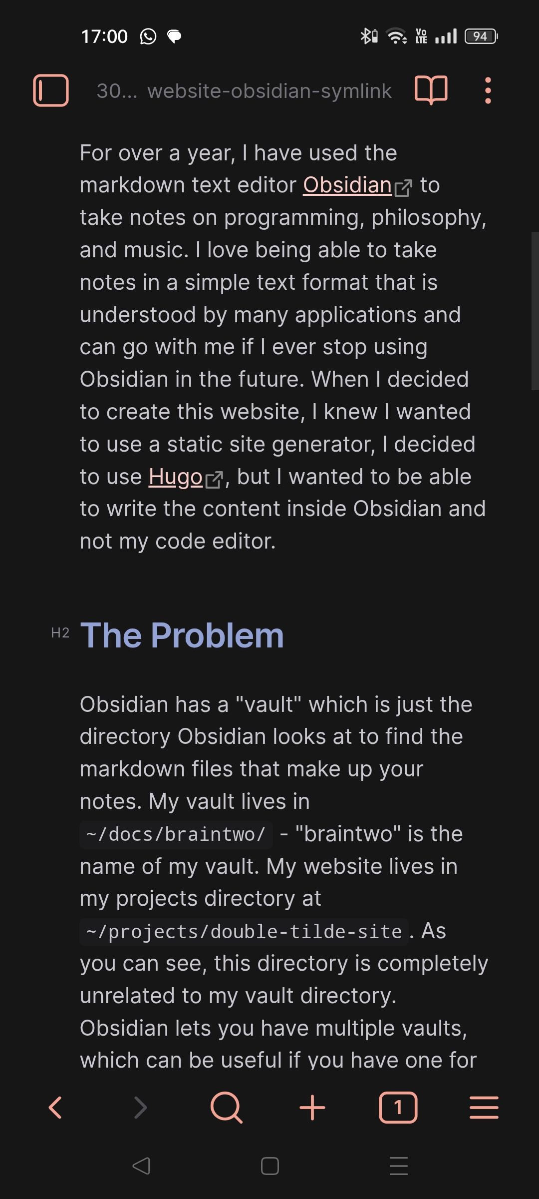 For over a year, I have used the markdown text editor Obsidian to take notes on programming, philosophy, and music. I love being able to take notes in a simple text format that is understood by many applications and can go with me if I ever stop using Obsidian in the future. When I decided to create this website, I knew I wanted to use a static site generator, I decided to use Hugo , but I wanted to be able to write the content inside Obsidian and not my code editor.