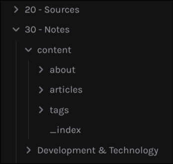 Feel free to rename this folder, I renamed mine to “Website”. If you look inside that folder, you should see the structure of your markdown files from your static site. Now you have the comfort of all of your Obsidian plugins and familiar interface for writing your articles. Any changes you make to the files through Obsidian you will see reflected in your code editor with the static site open or in the browser whilst serving the site locally.